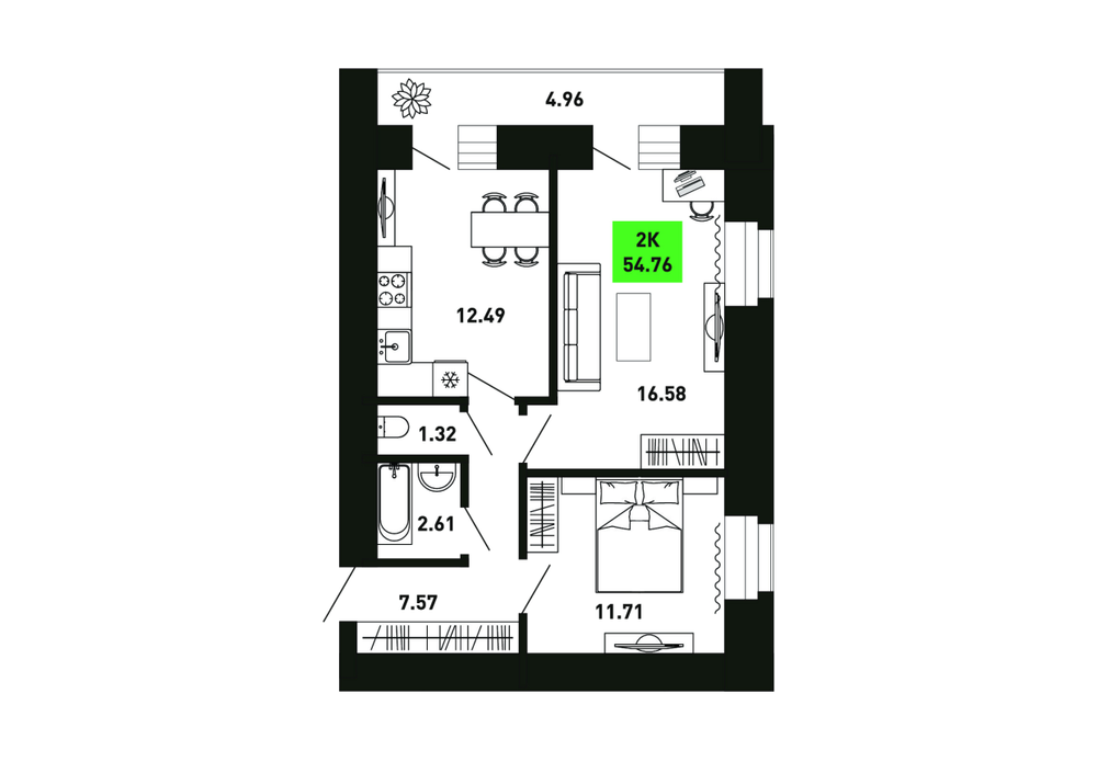 2-комнатная  57.77 м2